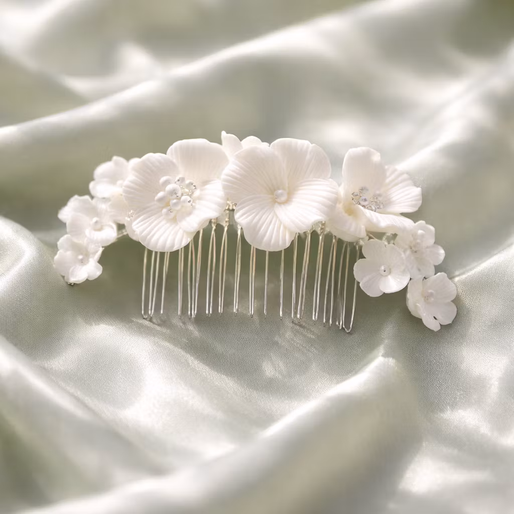 Ljuvlig kam med dekoration av blommor gjorda i keramik och med små pärlor som glimmar. Vacker i håruppsättningar till bröllop och fest. Passar alla hår. Då denn