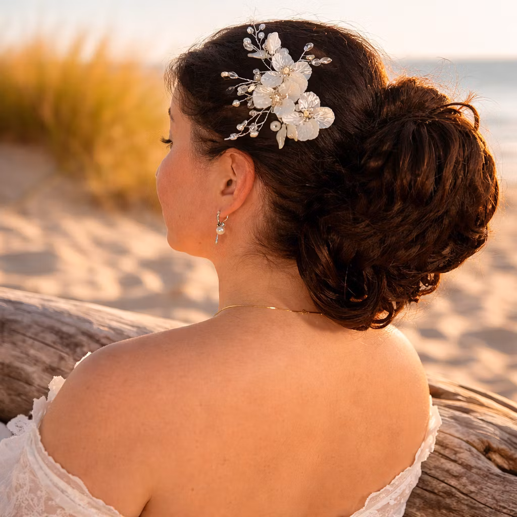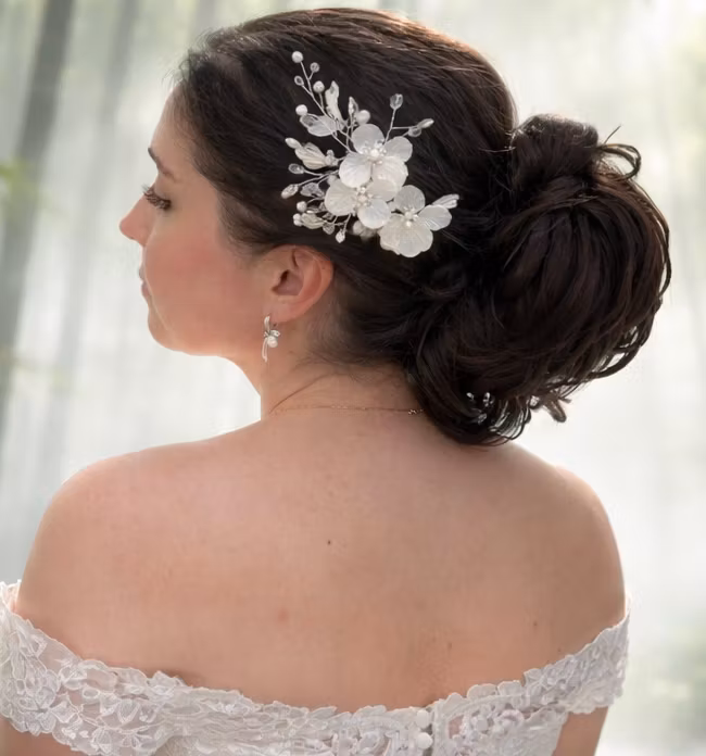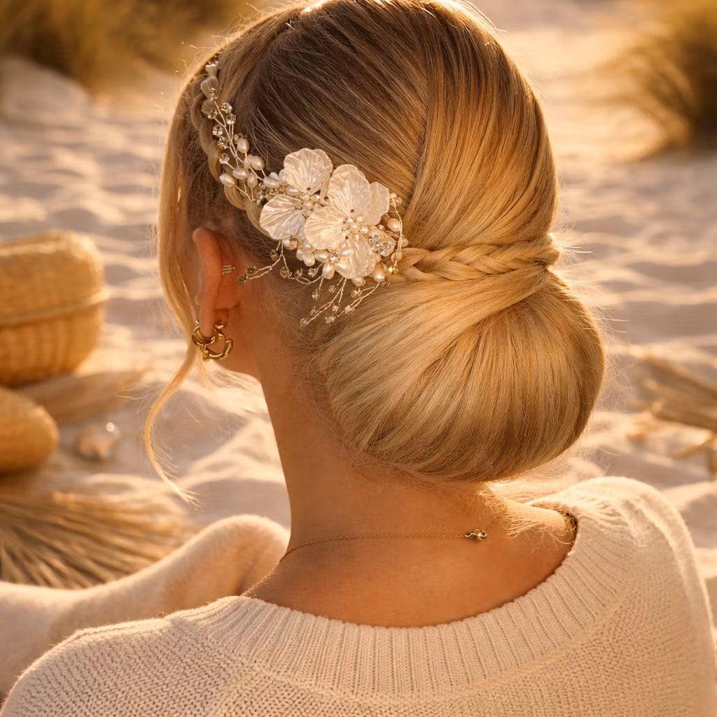 Ett ljuvligt hårspänne formad som blommor med pärlor på en tunn guldfärgad tråd, perfekt för bröllop eller fest med ett spänne baktill för enklare eller mer avancerade håruppsättningar. Detta spänne kan gärna placeras i håret på sidan eller i bak ihop med en bulle. Bra spänne för en frisör att kunna arbeta med, men också för den som vill göra en fin håruppsättning själv.