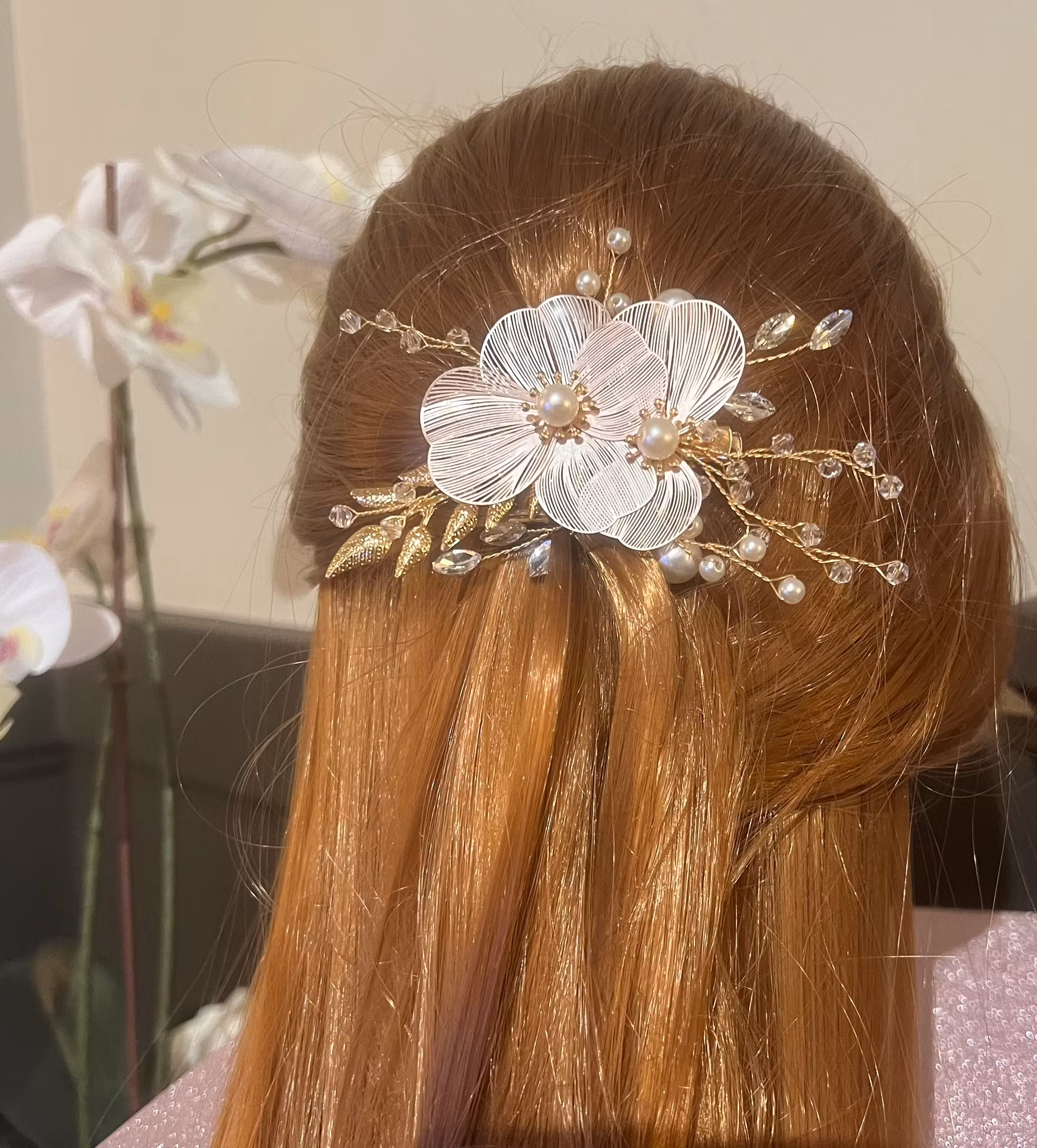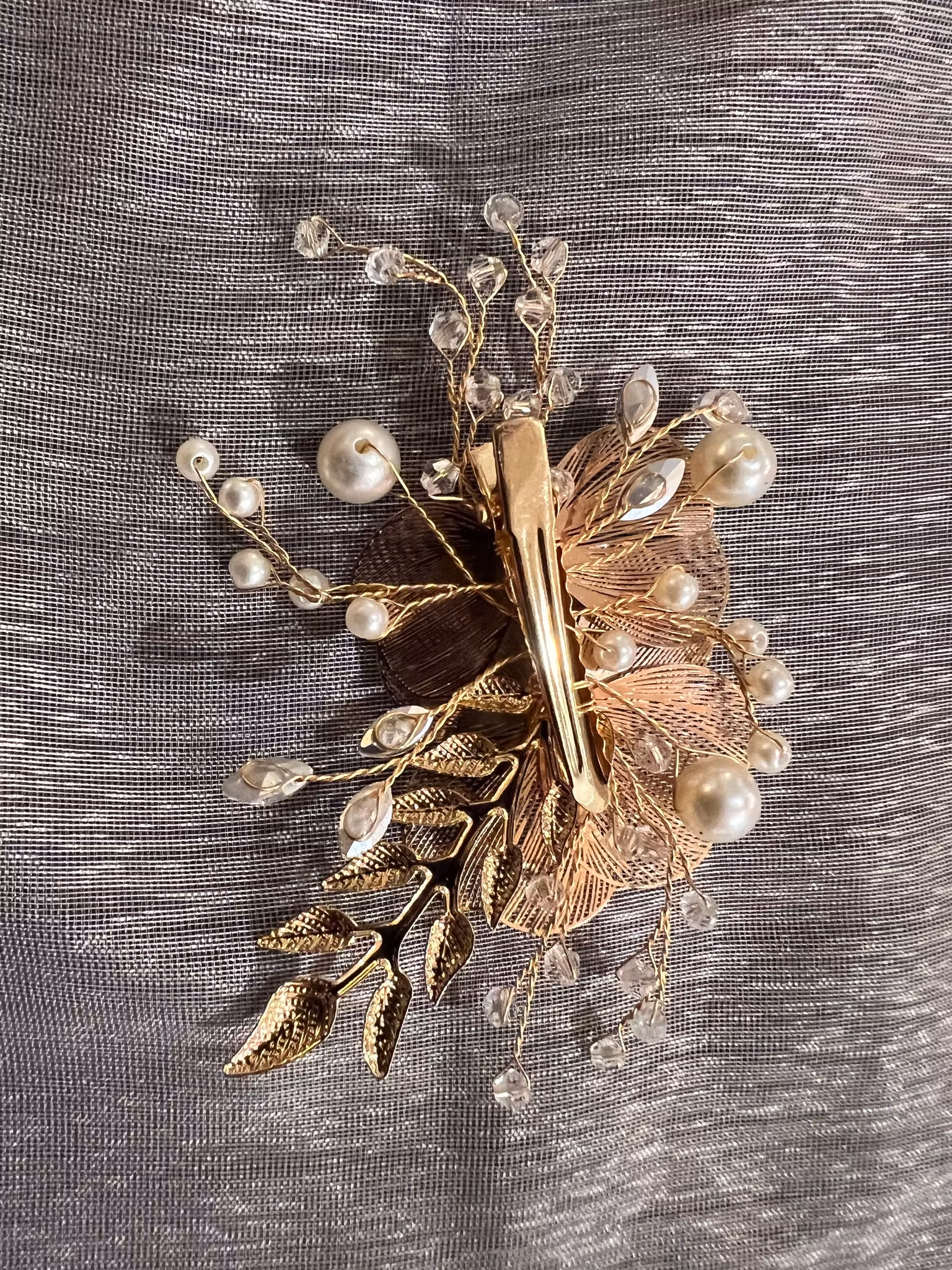 Ett mycket vackert och detaljerat hårspänne i pärlor och med tunna trådar i färgen roséguld. Ett clip spänne på baksidan för att enkelt kunna fästa för enkla eller mer avancerade håruppsättningar.