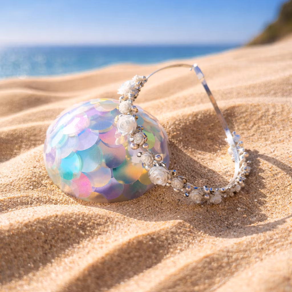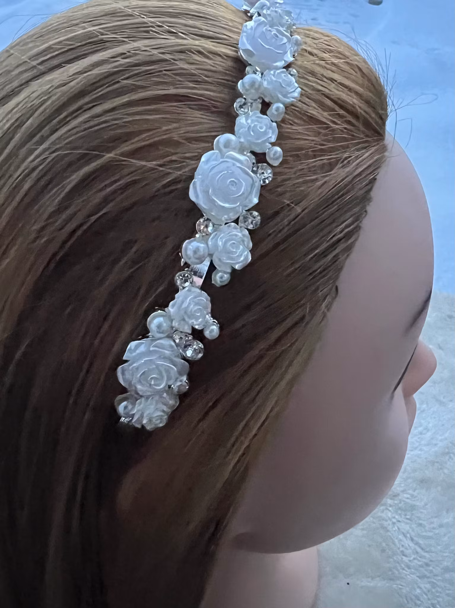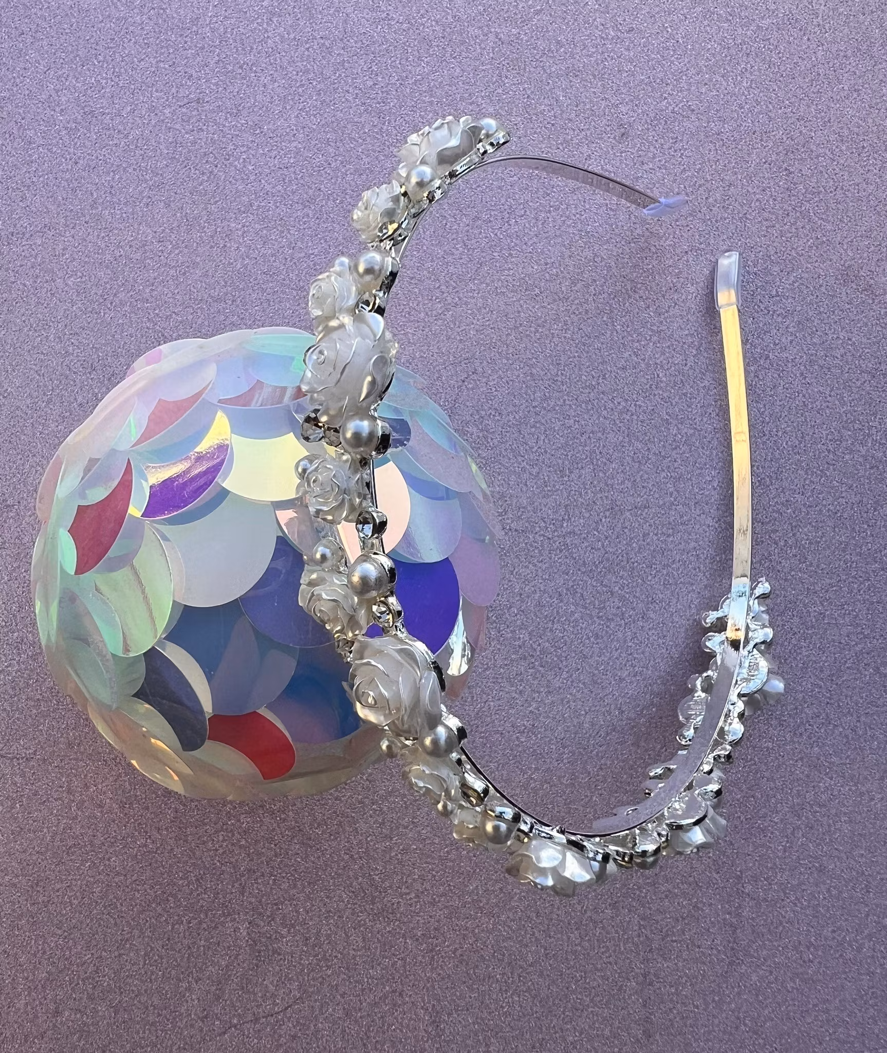 Vackert diadem i silverfärg med dekoration som små söta blommor, glittriga stenar och pärlor på.