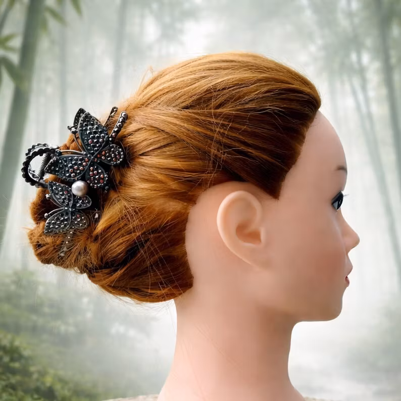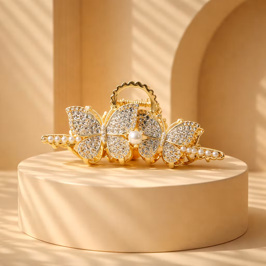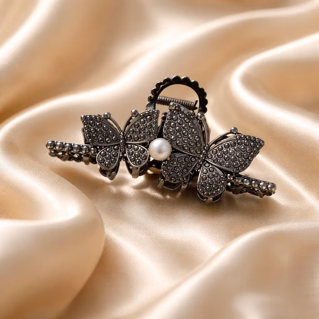 Hårklämma Fjäril i metall, välj mellan guldfärg eller antiksilver med fin pärla och små strass stenar. Passar till mellantjockt eller tjockt hår.