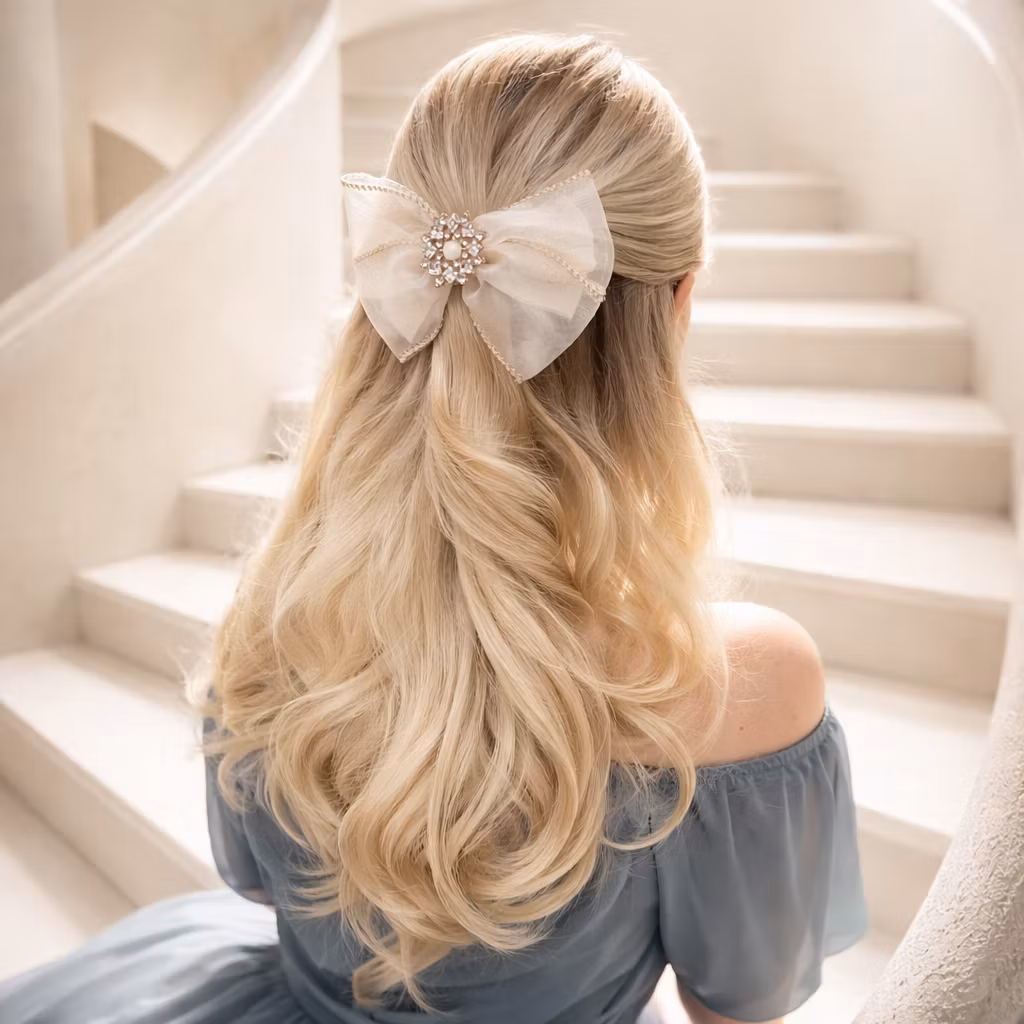 Söt hårklämma i tyg med gulddetaljer.Fransk spänne.Utvalda AI genererade bilder (bakgrunder)