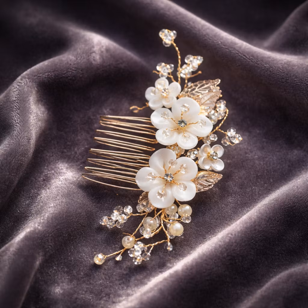 Ljuvlig kam med vackra detaljer såsom blommor, pärlor och glaspärlor. Passar för fina håruppsättningar till bröllop och fest. Kan placeras på sidan eller mitt bak på en håruppsättning. Då dessa är handgjorda kan produkter skilja sin åt lite grand.
