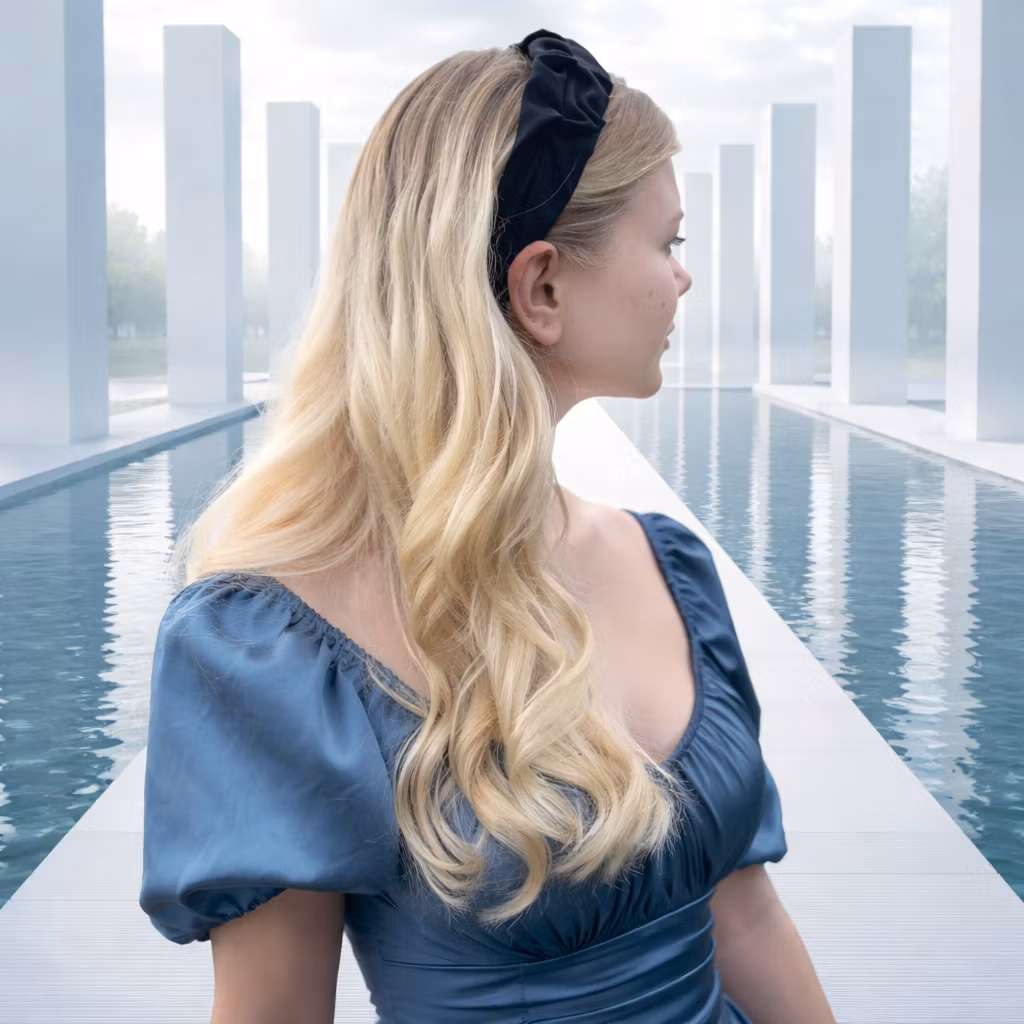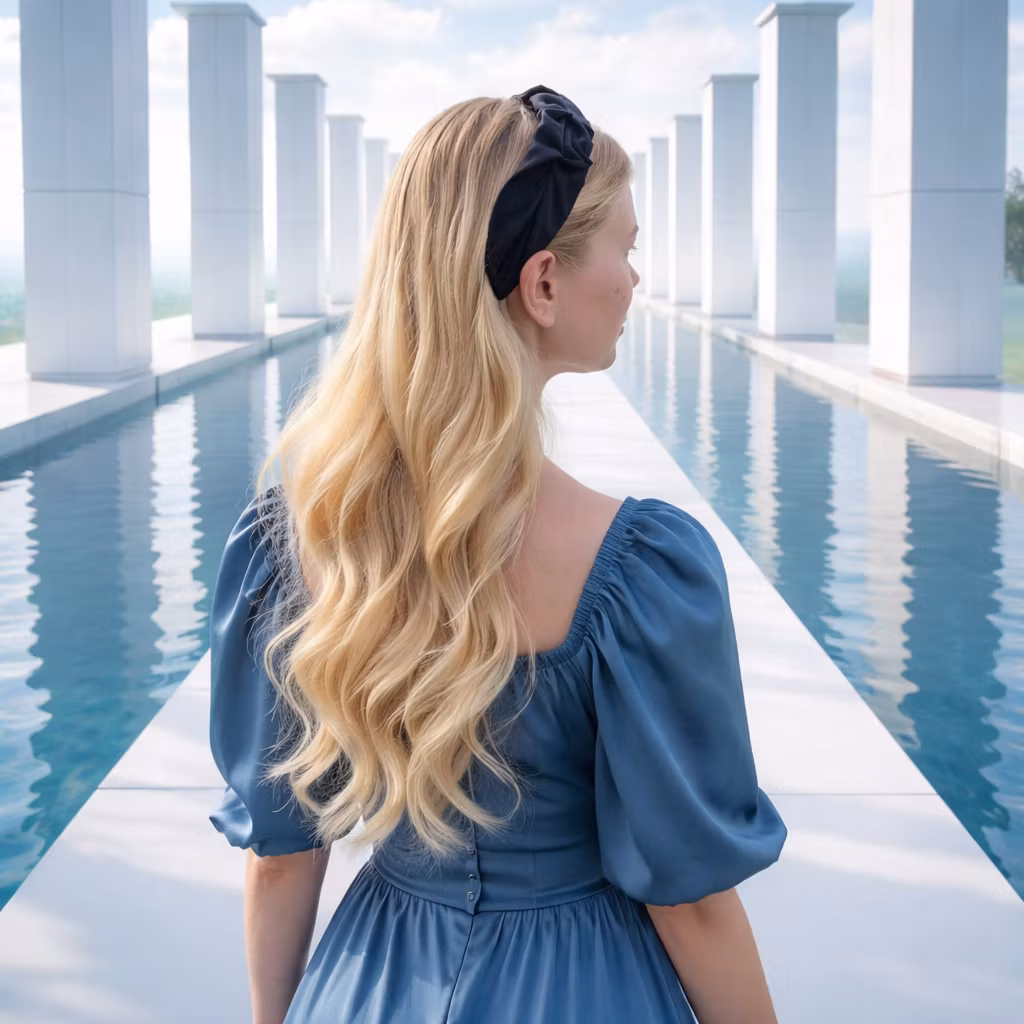 Snyggt och trendigt diadem i matt tyg.Skön att bära och den sitter bra utan att den klämmer för hårt.Hand MadeUtvalda bilder är AI genererade (bakgrunder)