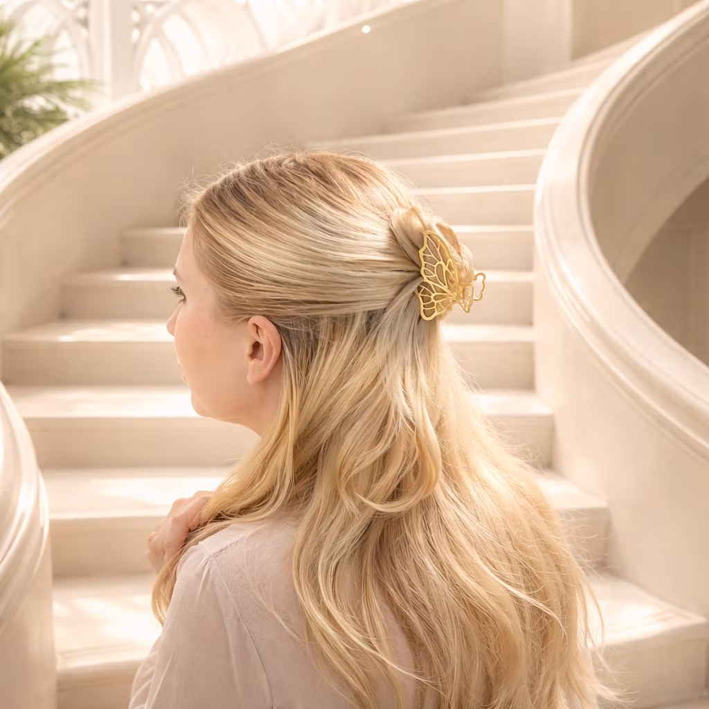 Söt hårklämma formad som en fjäril i guldfärg. Supersöt till halvuppsättningar.Utvalda bilder är AI genererade (bakgrunder)