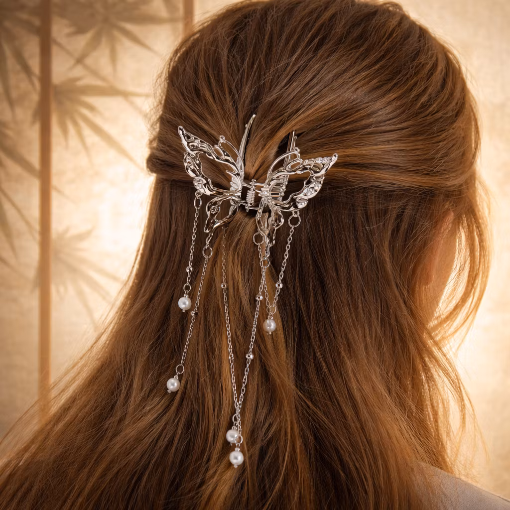Vackert detaljerad hårklämma formad som en fjäril med hänge.Vissa är AI genererade bilder (bakgrunder)