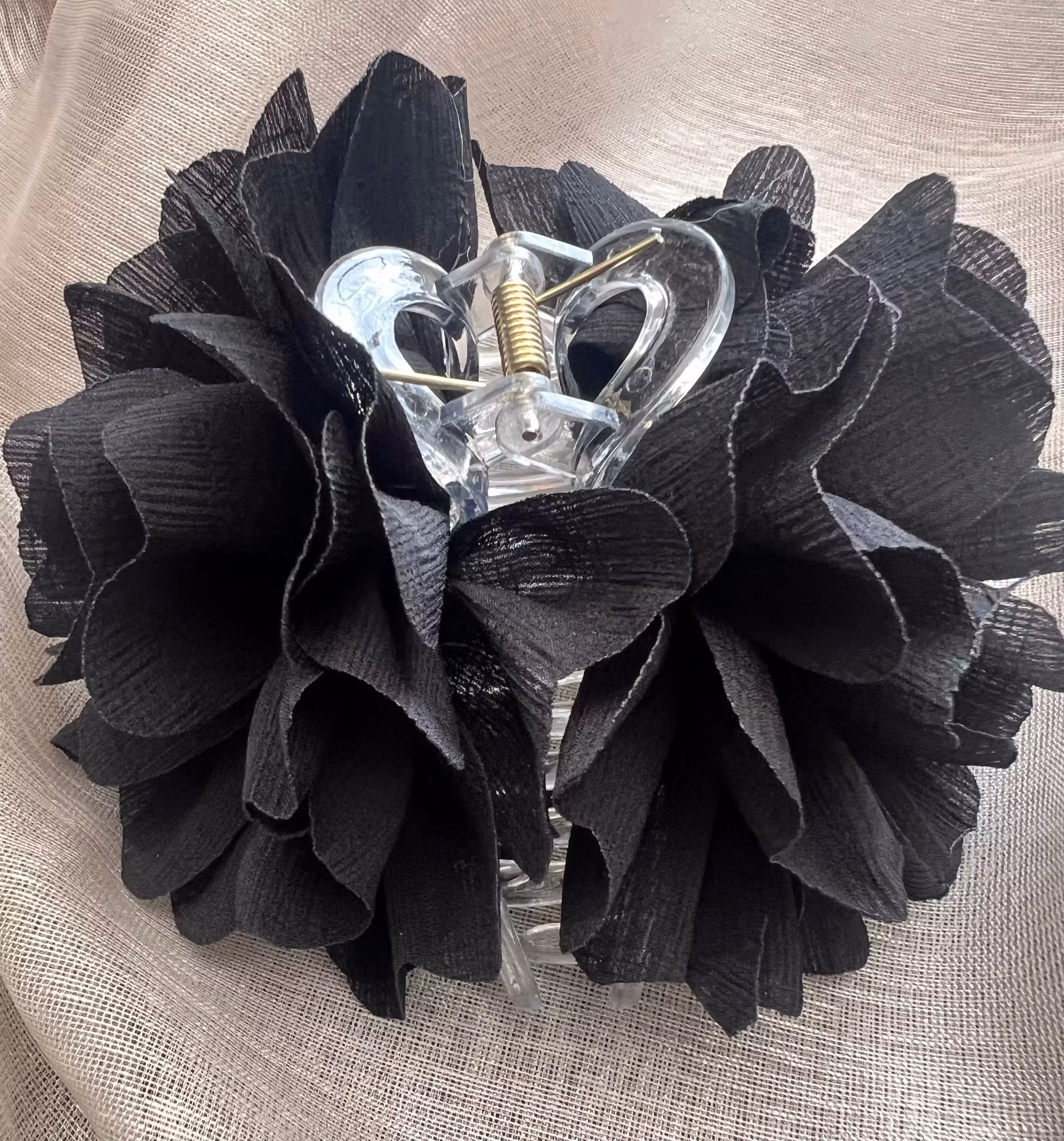Fin hårklämma som blomma i ljuvligt tunnare svart tyg.