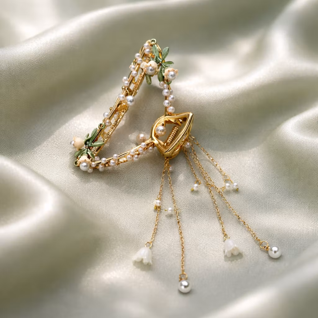 Elegant hårklämma i guldfärg med vackra dekorationer av pärlor och blommor och med hängen.
