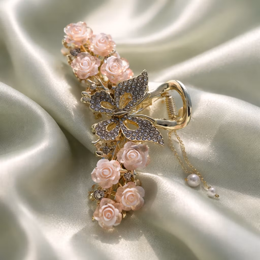 En elegant hårklämma i guldfärg med blommor i mild rosa och med pärlor som hänger. Denna är ljuvligt vacker till håruppsättningar inför bröllop, skolbaler, fester och till student. Passar mellantjockt eller tjockt hår.