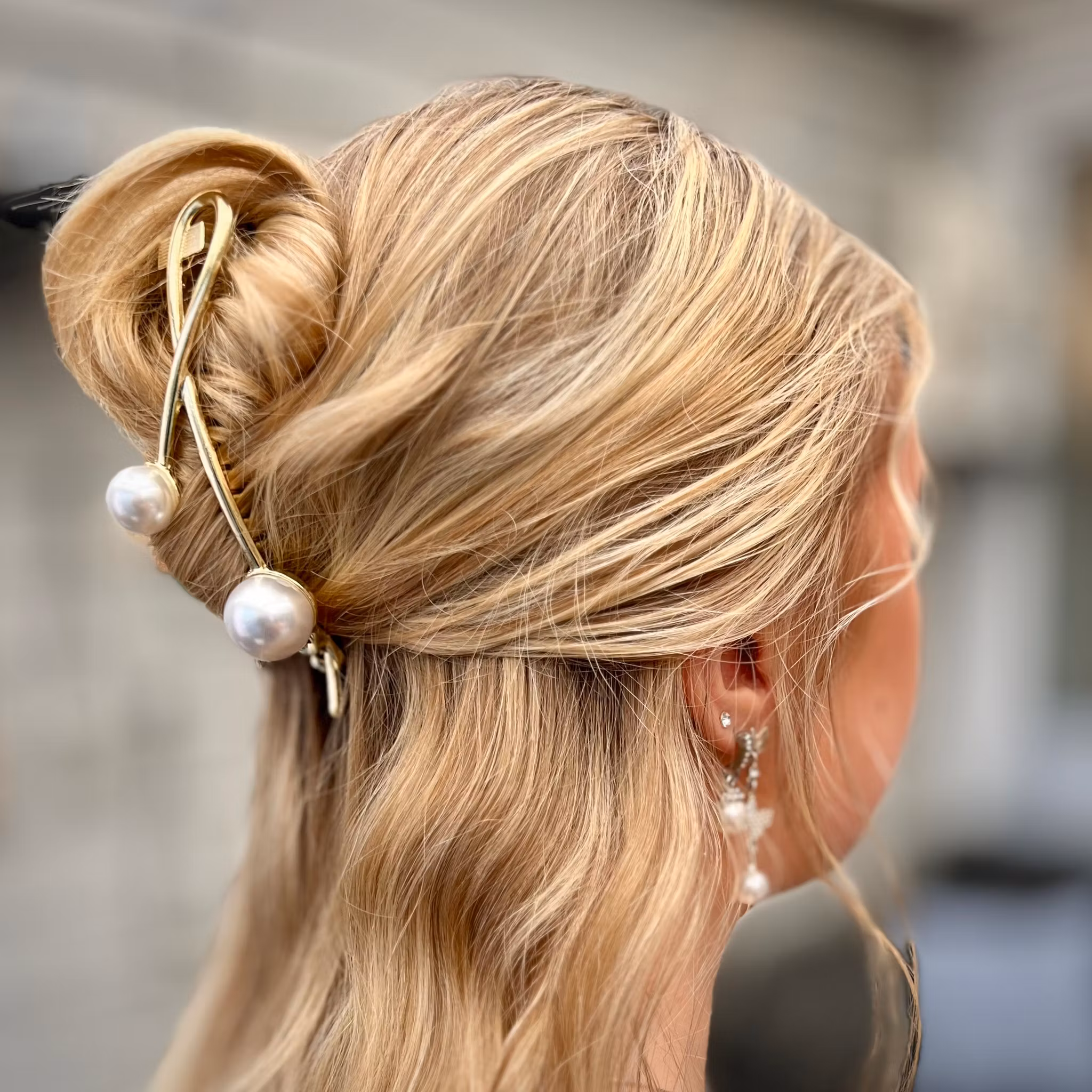 Hårklämma för fina håruppsättningar i Guldfärg med dekorativa pärlor.