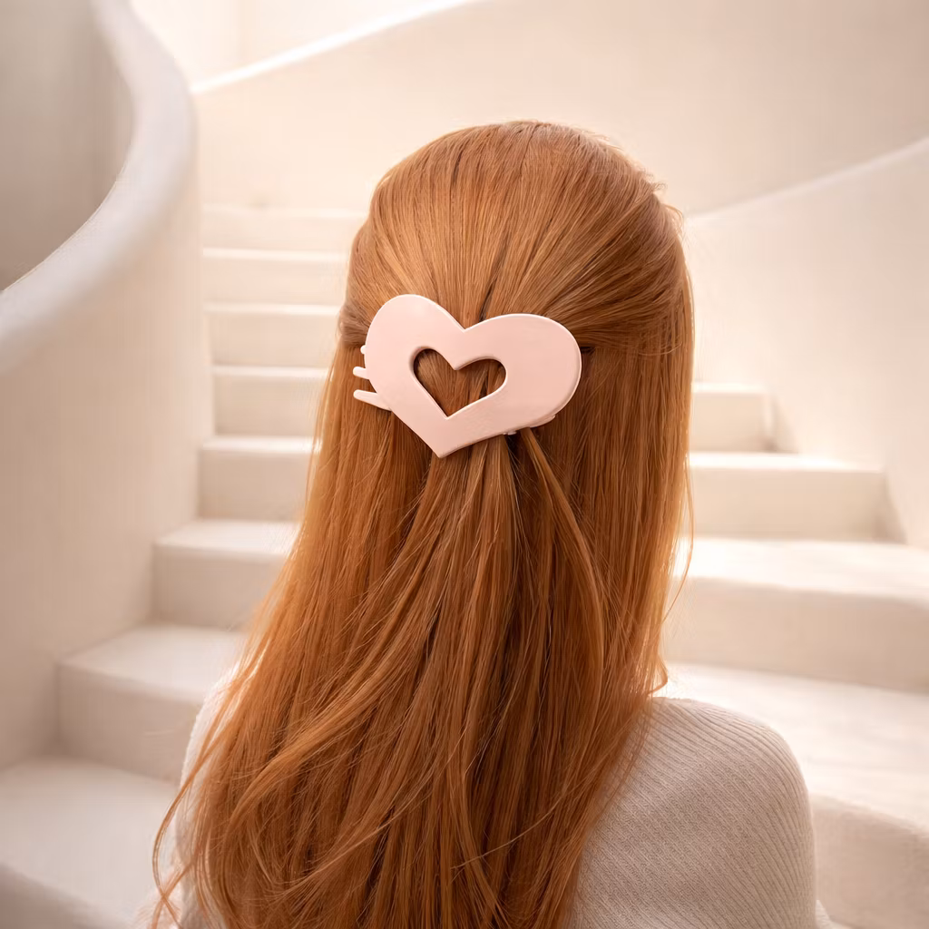 Den populära platta hårklämman formad som ett hjärta i ljus dimrosa.