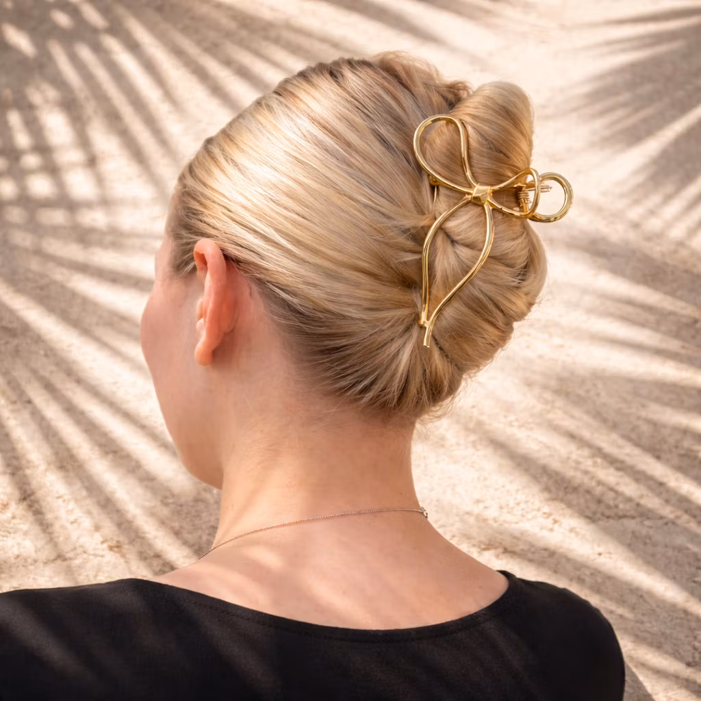 En vacker festlig hårklämma formad som en rosett i guldfärg.Sitter hårt i mellantjockt eller tjockt hår.Finns även i Silver.AI genererade bilder (bakgrunder)