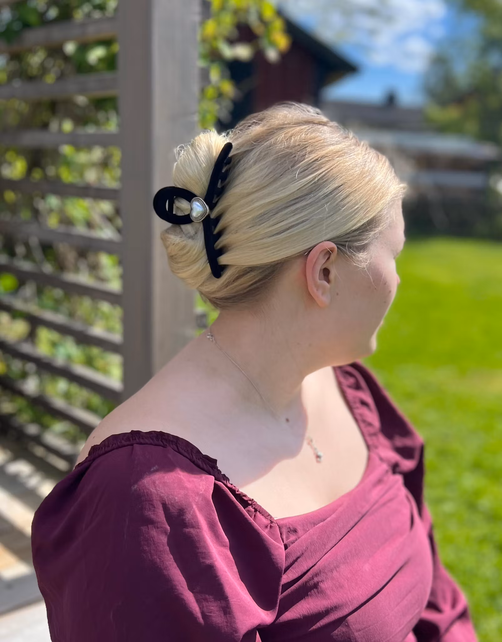 Sammetklädd hårklämma i svart med söt pärla formad som ett hjärta.