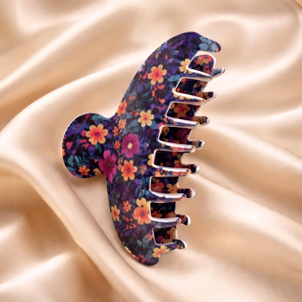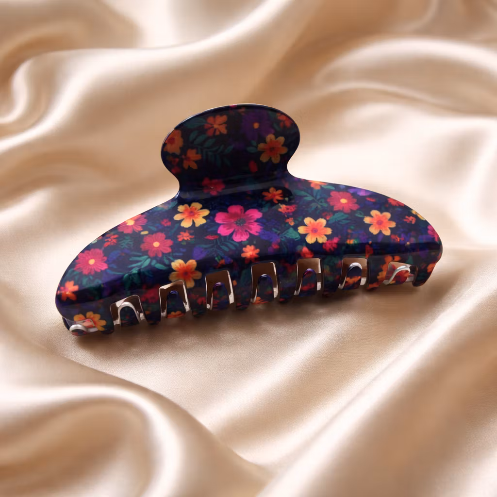 Underbart söt hårklämma med små blommor. Marinblå botten med blommor i orange, cerise och gul. Passar mellantjockt och tjockt hår.