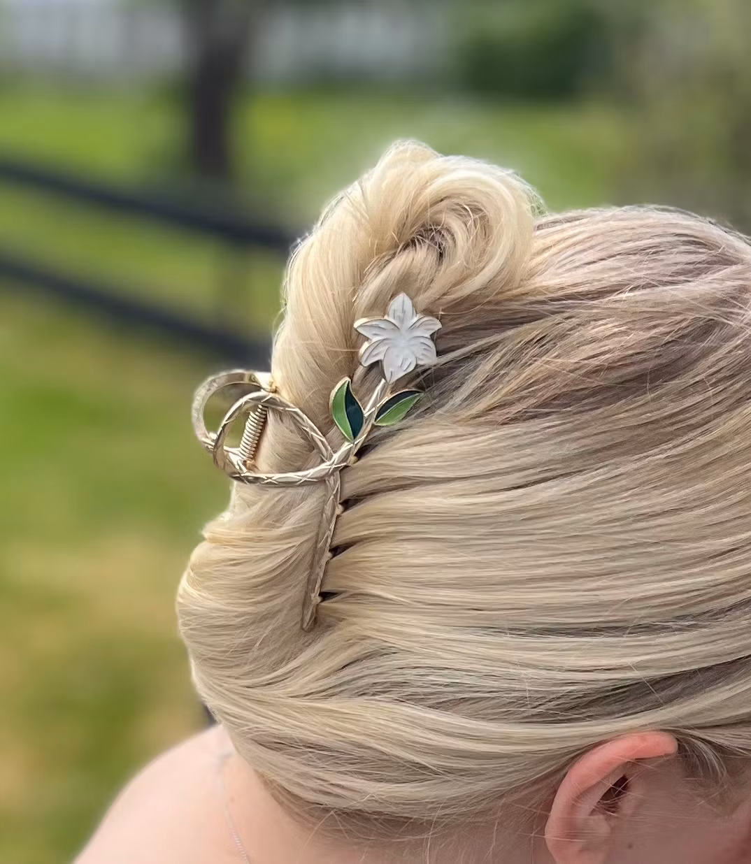 Söt och somrig hårklämma formad som en blomma med små blad. Klämman är i guldfärg och blomman vit. Passar till fest och vardag.