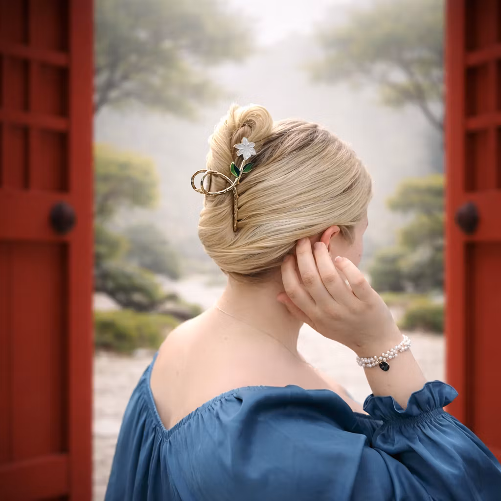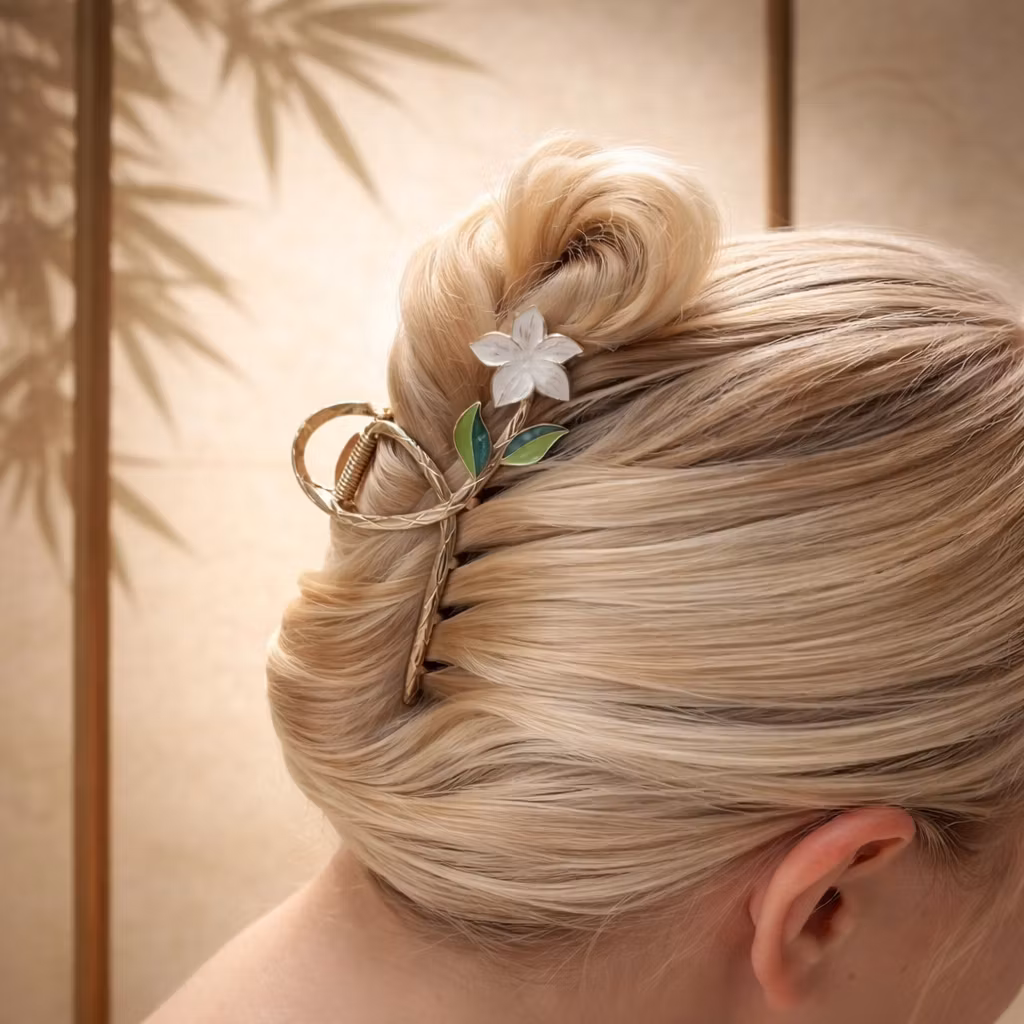 Söt och somrig hårklämma formad som en blomma med små blad. Klämman är i guldfärg och blomman vit. Passar till fest och vardag.Utvalda bilder är AI genererade (