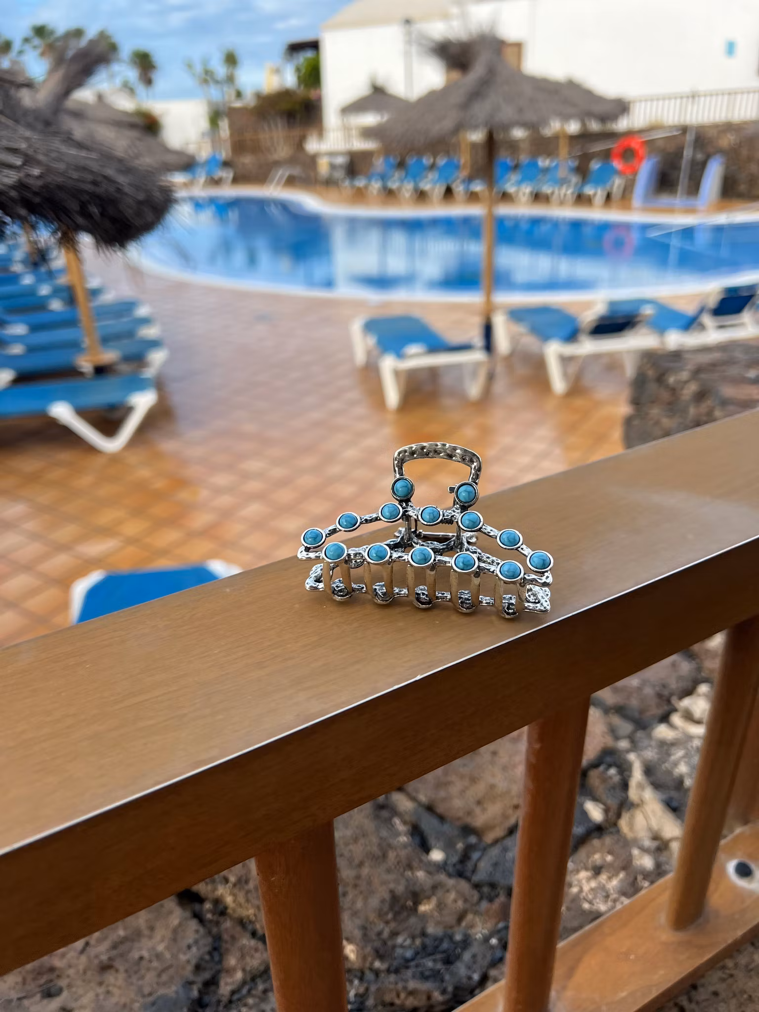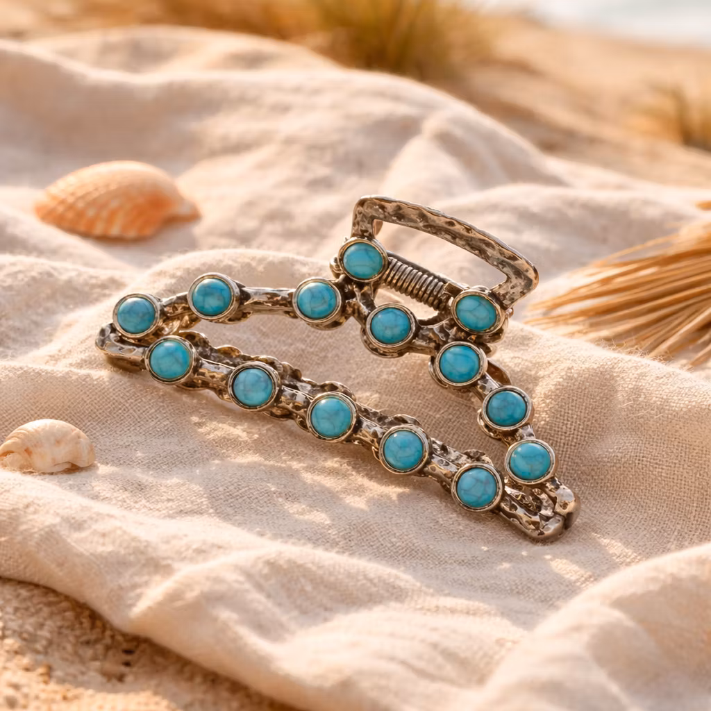 Vacker hårklämma i silverfärg med turkosa infällda stenar. Snygg i halvuppsättningar eller med hela håret uppsatt.