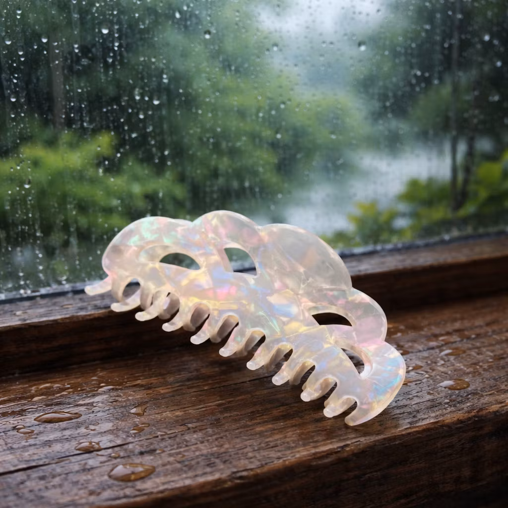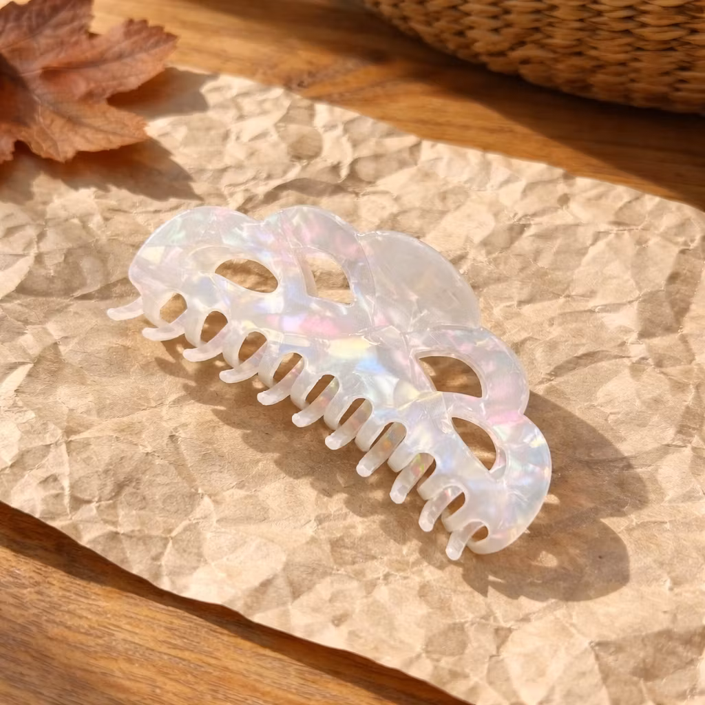 En fin och stor hårklämma i skimrande pärlemo lyster. Denna klämma har korslagda taggar, vilket gör att den sitter fast och bra i håret.