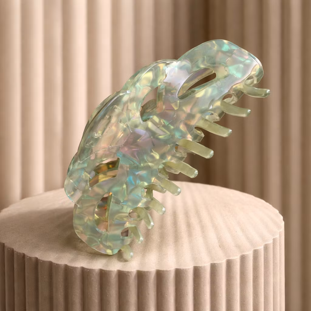 En fin och stor hårklämma i skimrande pärlemo lyster. Denna klämma har korslagda taggar, vilket gör att den sitter fast och bra i håret.Den finns i olivgrön och