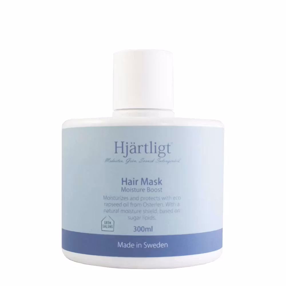 Hjärtligt® Hair mask Moisture Boost, passar den som behöver extra fukt till torrt eller slitet hår. Masken är berikad med ekologisk rapsolja, blåbär och ett sockerbaserat fuktskydd som gör att fukten kommer ner på djupet i strået. Efterlämnar håret återfuktat, glansigt och silkesmjukt helt utan silikoner.