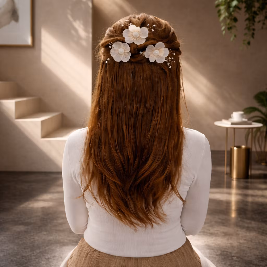 Underbara hårnålar i 3 - pack i svagt rosa färg och nålen i guldfärg.. Med de vackra pärlorna som dekoration till blommorna, gör dessa en exklusiv och vacker håruppsättning. Passar till håruppsättningar till bröllop och fest att kunna använda en och en, eller alla tre tillsammans. Passar alla hårtyper.