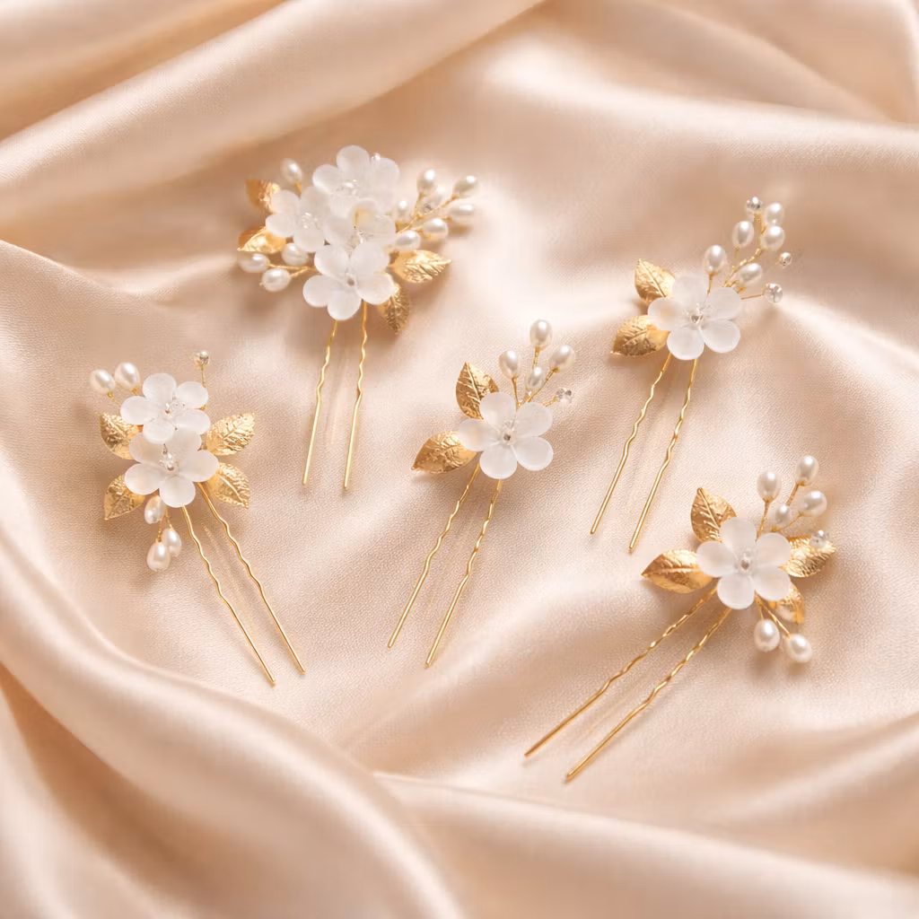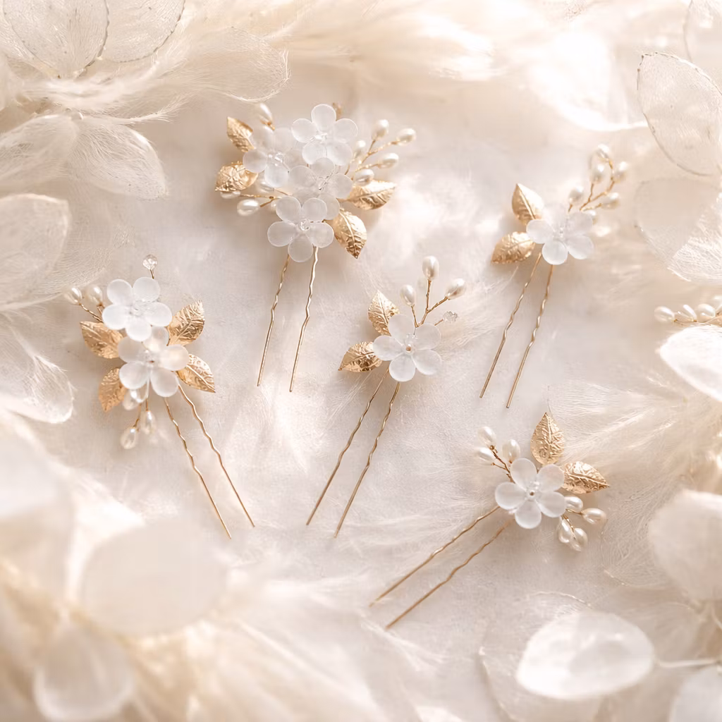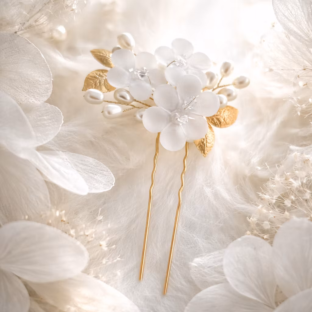 Vackert set med hårnålar för fina håruppsättningar till bröllop, student och fester. Hårnålarna har fina guldfärgade blad, vita små pärlor och vita glasliknande blommor som ger en festlig och exklusiv design.