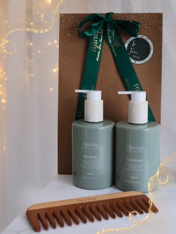 Ge bort en omtänksam julgåva fylld med svensktillverkad, naturlig hårvård och känslan av ett lugnt hemmaspa. Hjärtligt® Juledition Spa Collection innehåller två 300 ml fullsize-produkter ur vår populära originalserie. Hjärtligt® SPA Schampo och Balsam tillsammans med en bredtandad kam i en elegant brun presentkartong med Hjärtligt®-tryck.