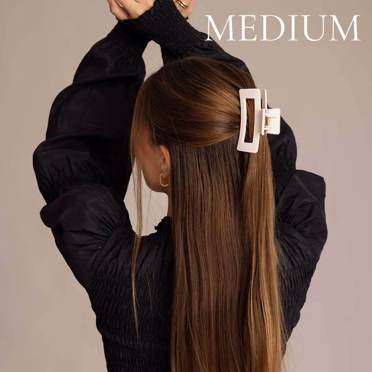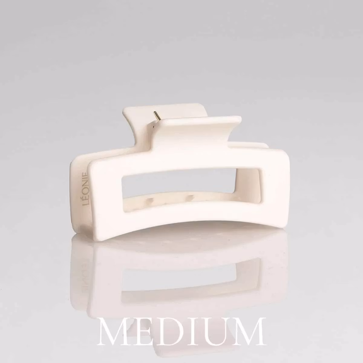 Vår mellanstora hårklämma i matt cremevit gjord i tåligt polykarbonat, passar för dig med tunnare till tjockare hår som är ute efter en stilren halvuppsättning. För dig med tunnare eller kortare hår fungerar vår mellanstora klämma även perfekt för heluppsättningar.
