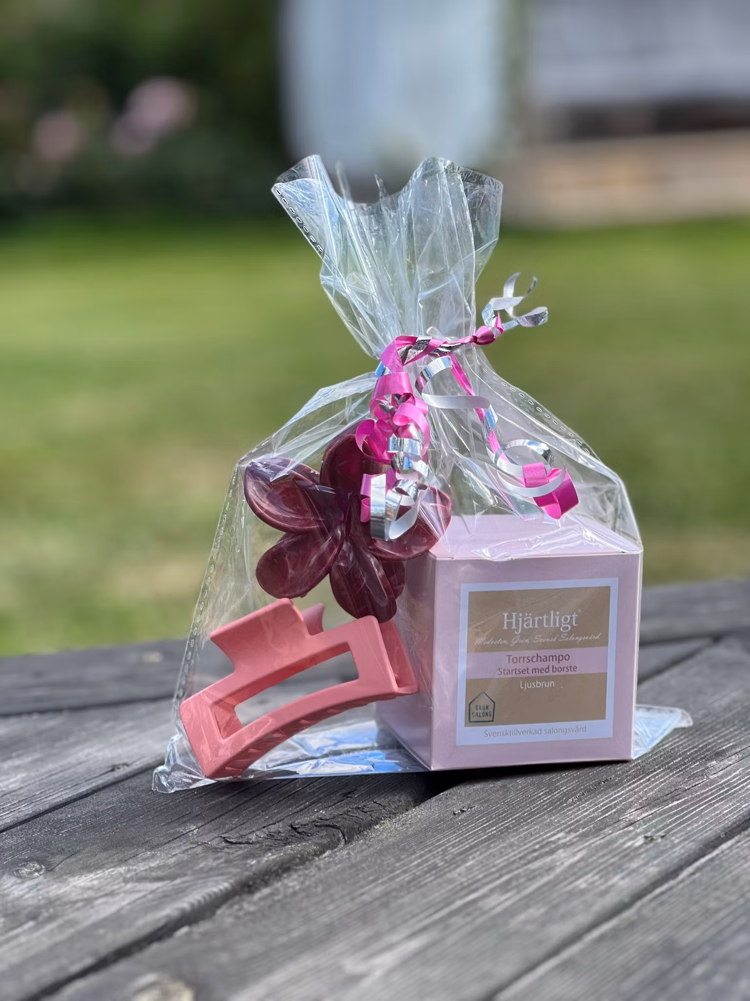 PresentförpackningPaketet innehåller:Hjärtligt Torrschampo Ljusbrun Hårklämma Rak RosaÄggblomma Vinröd.Om Hjärtligt Torrschampo:Hjärtligts prisvinnande tor