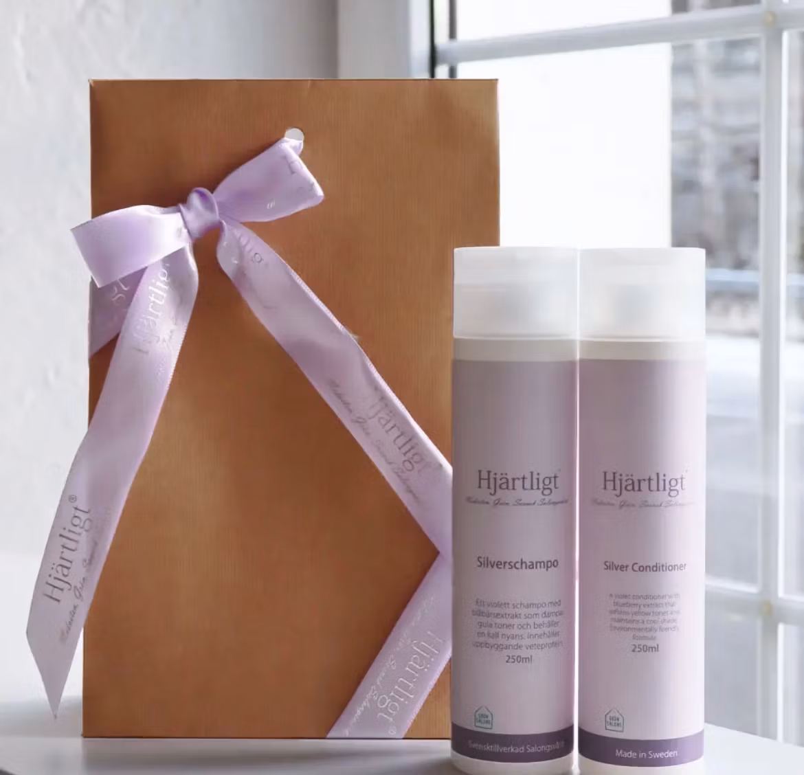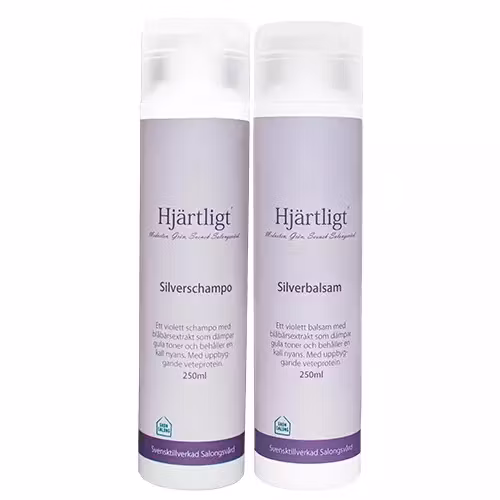 Ett paket med Ekologiskt Silverschampo 250ml och Silverbalsam 250ml frisörprodukter. Cruelty free & Biologiskt nedbrytbar och Grön salong godkänt.Hjärtligt