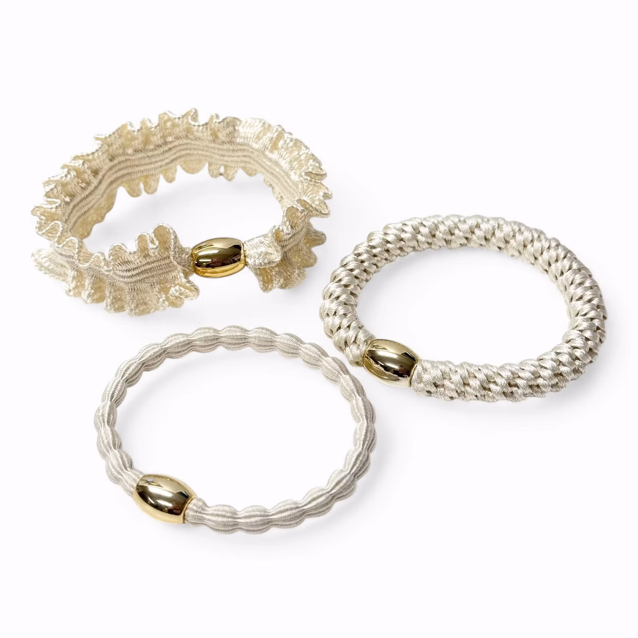 Elegant 3-pack cremevita hårsnoddar, förpackade i en stilren och genomskinlig presentask prydd med Stella Details logotyp. Hårsnoddarna är tillverkade av högsta kvalitet, vilket gör att de sitter bekvämt och stadigt i håret. Dessutom är de lika vackra att bära runt handleden – en perfekt kombination av stil och funktion!