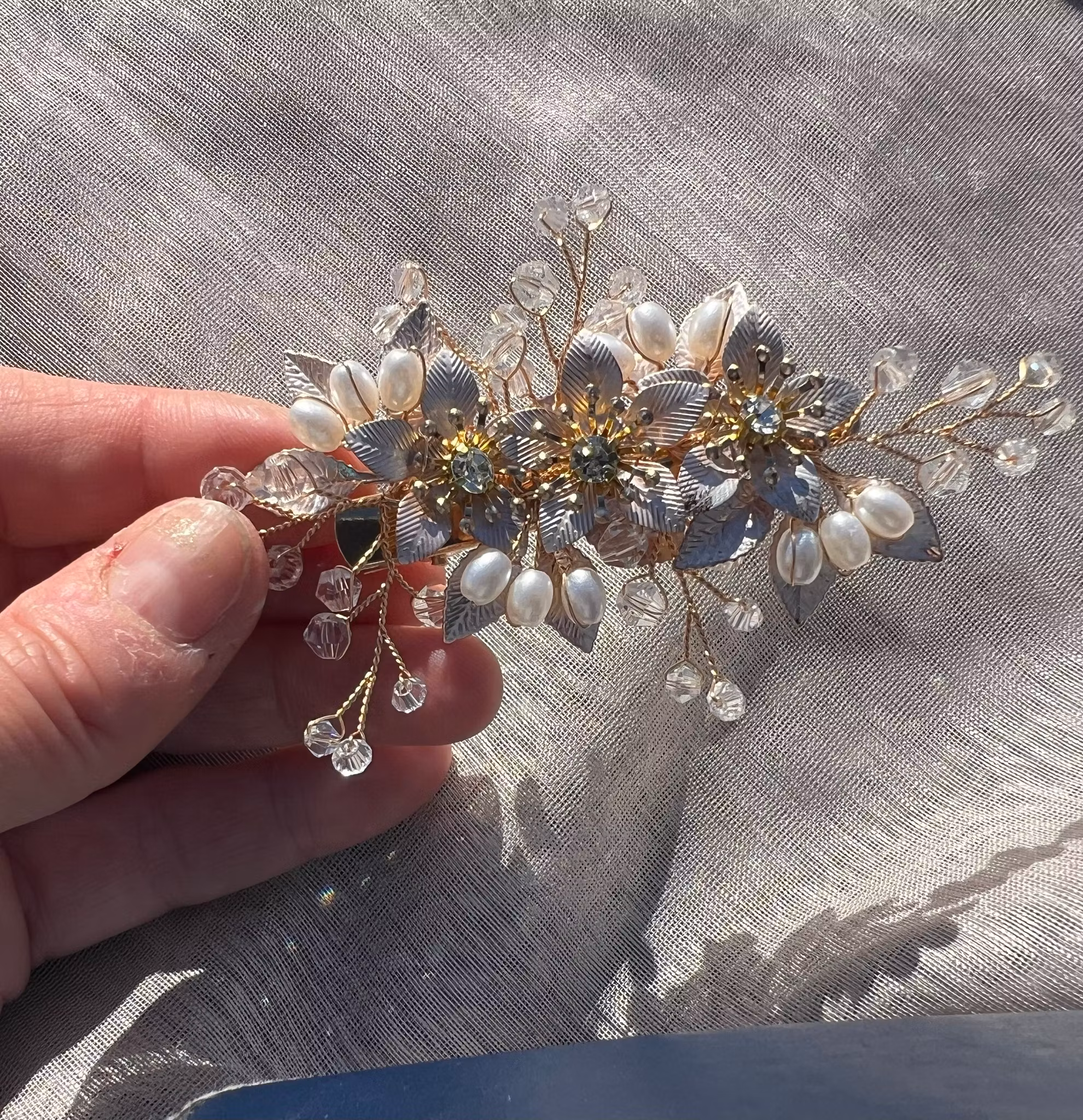 Vackert hårspänne i roséguldfärg med pärlor, stenar och formade blomblad. Vacker till bröllop eller fest.Handmade